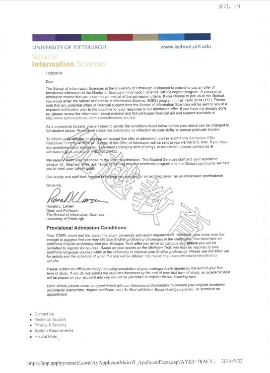恭喜優(yōu)越教育成功幫助這位陳同學(xué)成功申請到匹茲堡大學(xué)研究生信息科學(xué)專業(yè),歡迎隨時在線咨詢優(yōu)越教育,我們的客服24小時在線,感謝您的咨詢!