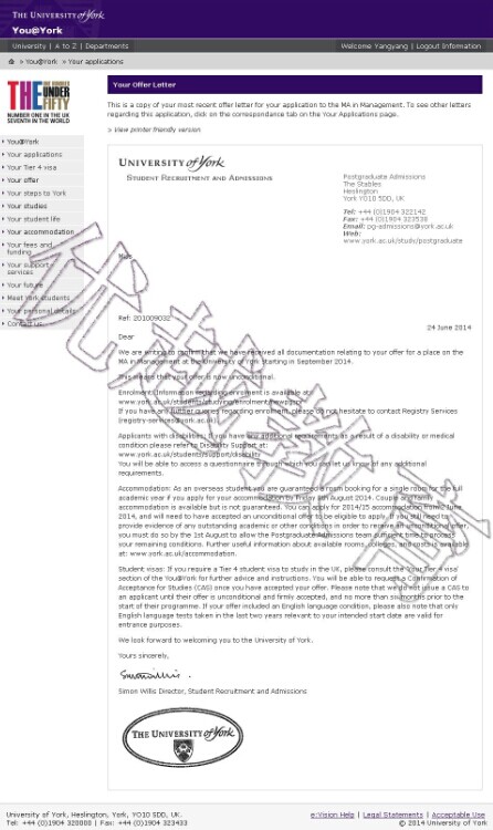 恭喜優(yōu)越教育成功幫助這位宋同學(xué)成功申請到約克大學(xué)研究生管理專業(yè),歡迎隨時(shí)在線咨詢優(yōu)越教育,我們的客服24小時(shí)在線,感謝您的咨詢!
