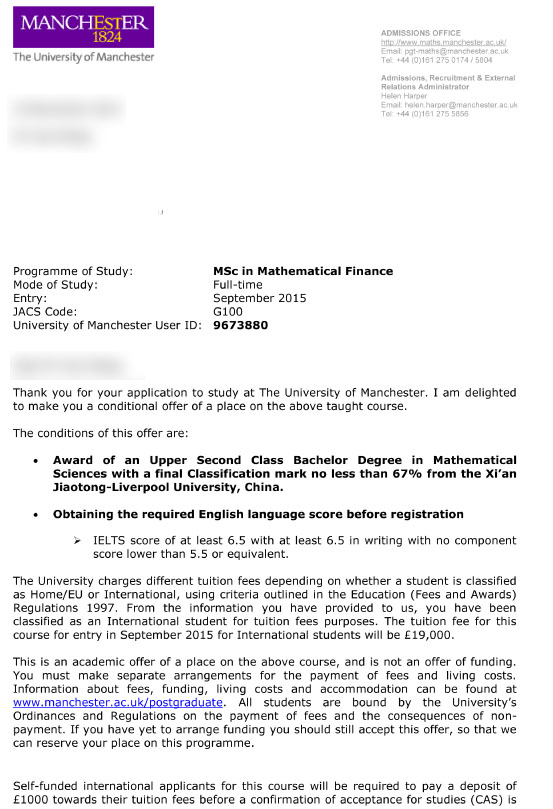 恭喜優(yōu)越教育成功幫助這位吳同學(xué)成功申請(qǐng)到曼徹斯特大學(xué)數(shù)學(xué)金融專業(yè),歡迎隨時(shí)在線咨詢優(yōu)越教育,我們的客服24小時(shí)在線,感謝您的咨詢!