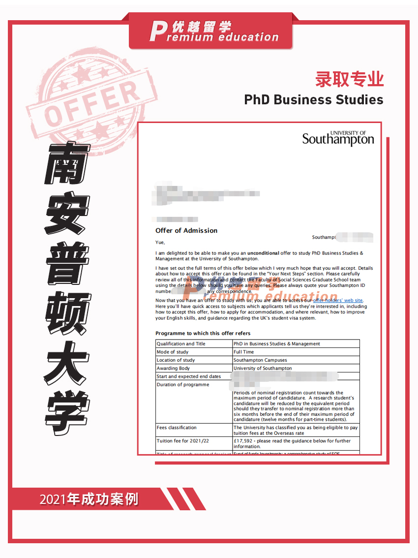 2021offer:恭喜張同學(xué)獲得南安普頓大學(xué)商業(yè)研究博士碩士通知書