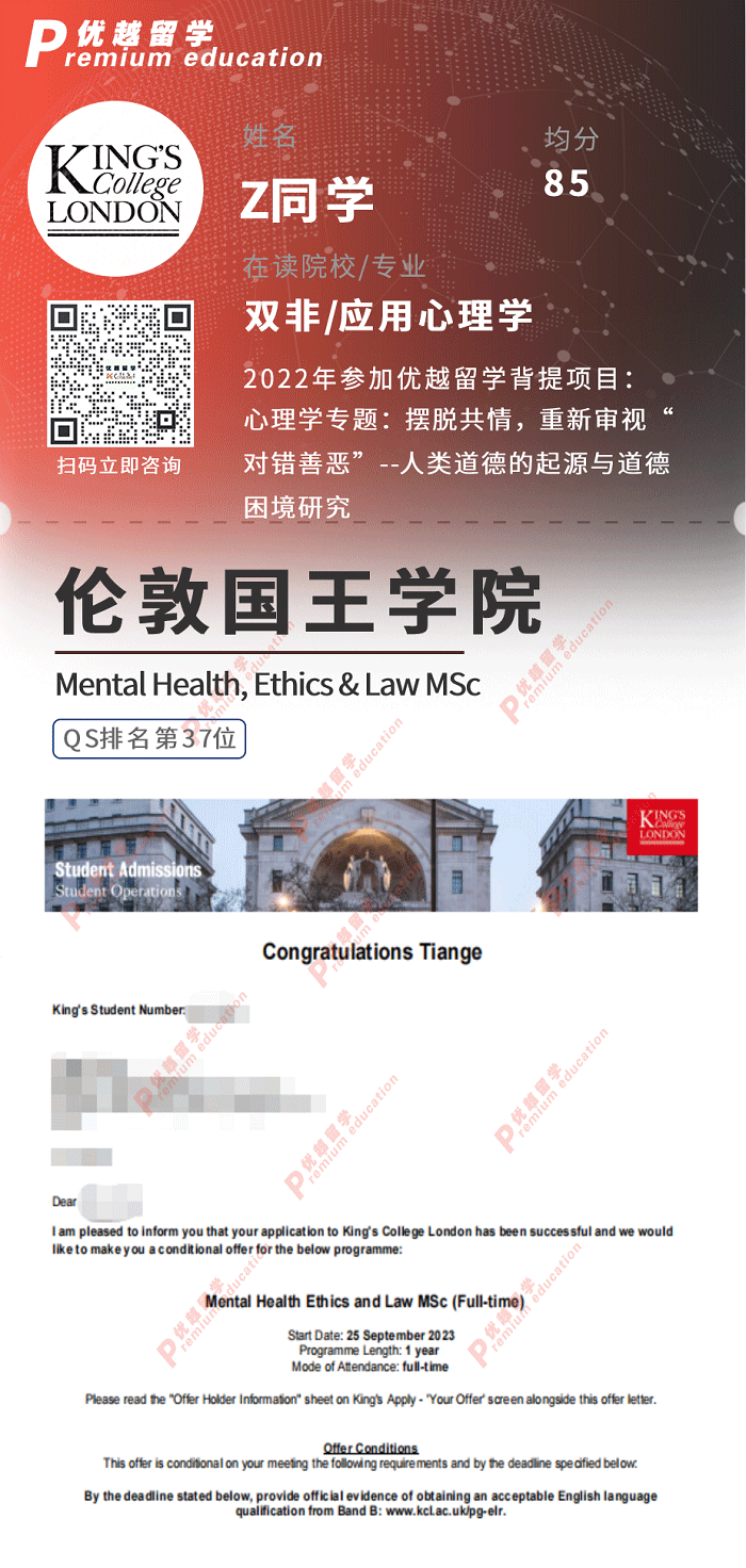 2023offer:恭喜Z同學(xué)在碩士留學(xué)申請中獲得KCL心理健康、倫理與法律碩士通知書!