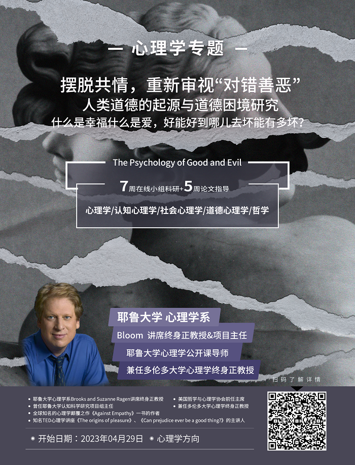 1.本項目適合認(rèn)知心理學(xué),人格心理學(xué)、哲學(xué)、社會心理學(xué)等專業(yè)感興趣的學(xué)生。以及對人類價值觀研究,社會道德演變等話題感性興趣并想跟隨名校導(dǎo)師深入了解學(xué)習(xí)的學(xué)生。