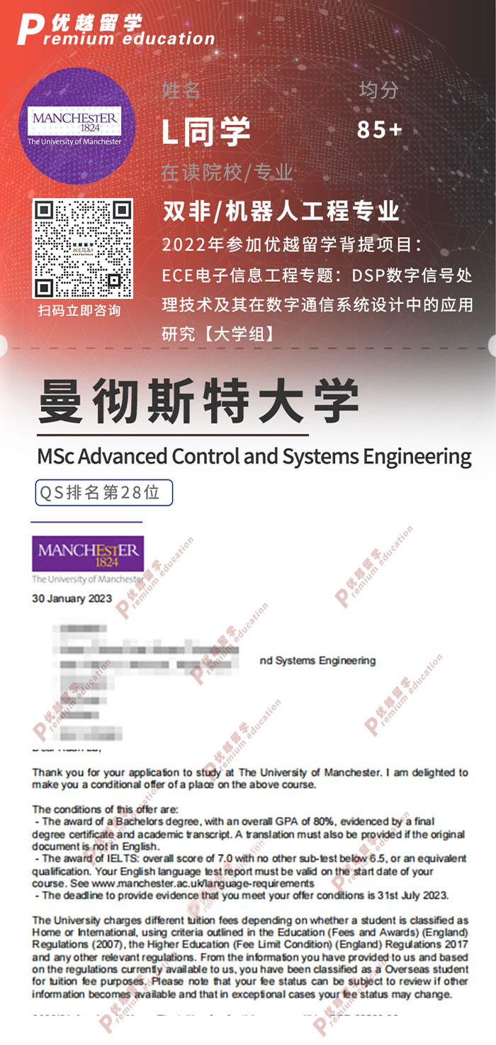 2023offer:恭喜L同學(xué)在碩士留學(xué)申請中獲得曼徹斯特大學(xué)高級控制與系統(tǒng)工程碩士通知書!