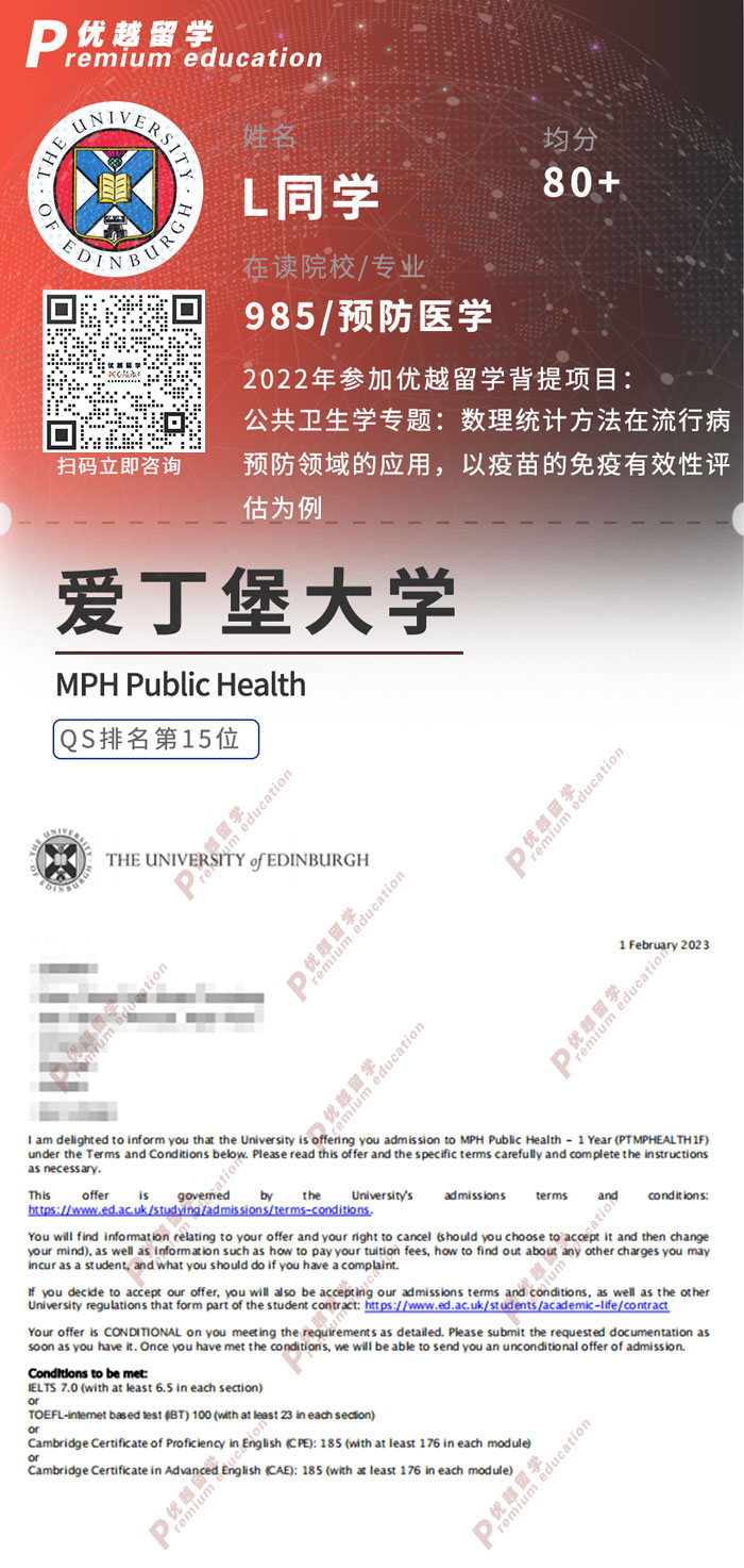 2023offer:恭喜L同學在碩士留學申請中獲得愛丁堡大學公共衛(wèi)生碩士通知書!