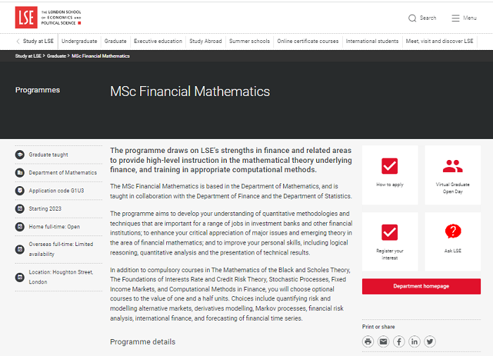 該計劃利用倫敦政治經(jīng)濟學(xué)院在金融和相關(guān)領(lǐng)域的優(yōu)勢,提供金融基礎(chǔ)數(shù)學(xué)理論的高級指導(dǎo),以及適當(dāng)計算方法的培訓(xùn)。該項目設(shè)在數(shù)學(xué)系,與金融系和統(tǒng)計系合作授課。該計劃旨在加深學(xué)生對定量方法和技術(shù)的理解,這些方法和技術(shù)對于投資銀行和其他金融機構(gòu)的一系列工作很重要;增強學(xué)生對金融數(shù)學(xué)領(lǐng)域的重大問題和新興理論的批判性認(rèn)識;并提高個人技能,包括邏輯推理、定量分析和呈現(xiàn)技術(shù)結(jié)果。