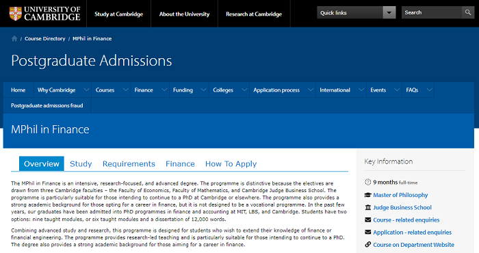 金融碩士是一個密集的以研究為重點的高級學(xué)位。該課程的特殊之處在于,選修課來自三個劍橋?qū)W院——經(jīng)濟學(xué)院、數(shù)學(xué)學(xué)院和劍橋賈奇商學(xué)院。該計劃特別適合那些打算繼續(xù)在劍橋或其他地方攻讀博士學(xué)位的人。該項目還為那些選擇金融職業(yè)的人提供了強大的學(xué)術(shù)背景,但它并不是一個職業(yè)項目。在過去的幾年里,該項目的畢業(yè)生被麻省理工學(xué)院、倫敦商學(xué)院和劍橋大學(xué)的金融和會計博士項目錄取。學(xué)生有兩種選擇:九個教學(xué)模塊,或六個教學(xué)模塊和一篇12,000字的論文。