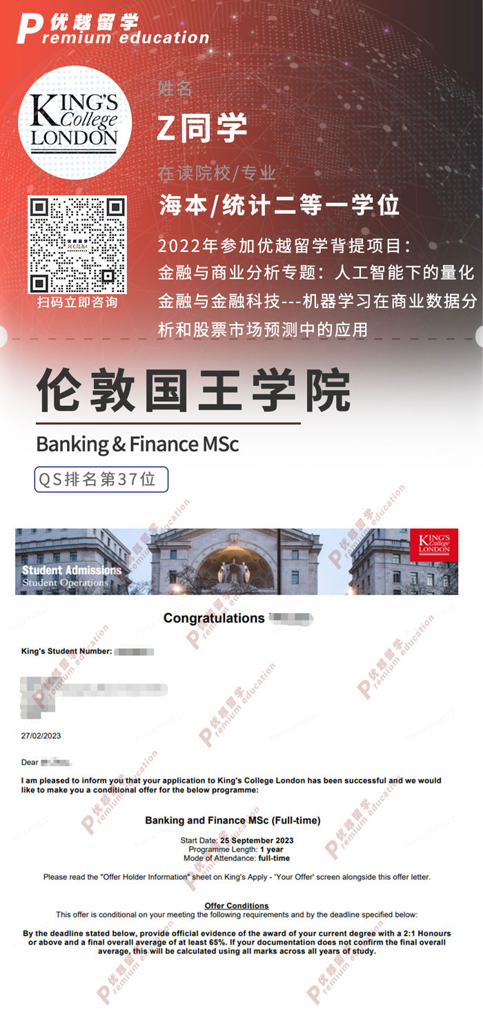 2023offer:恭喜Z同學(xué)在碩士留學(xué)申請中獲得KCL銀行與金融碩士通知書!