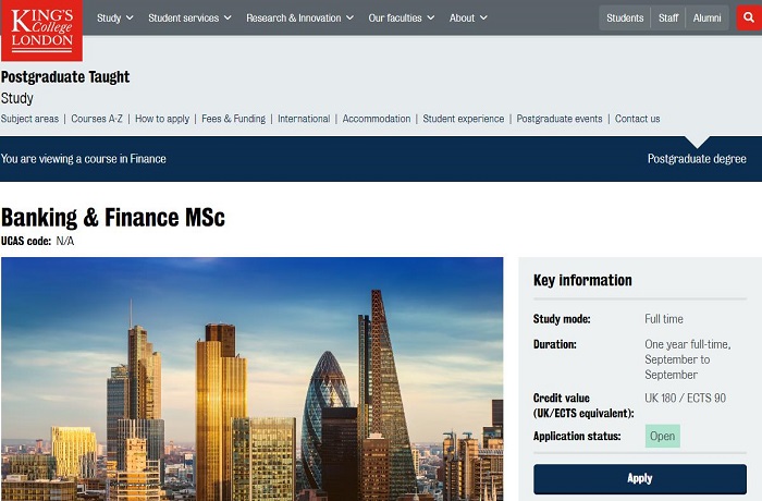 銀行與金融碩士(MSc Banking and Fiance)隸屬于KCL商學(xué)院,適合在本科階段學(xué)習(xí)過金融、管理/商業(yè)/經(jīng)濟(jì)學(xué),或來自數(shù)學(xué)、工程或物理等量化學(xué)科的學(xué)生。該專業(yè)提供全面的金融教育,主題廣泛,包括商業(yè)和投資銀行業(yè)務(wù)、金融衍生品、風(fēng)險管理、金融監(jiān)管和行為金融。課程還側(cè)重于有重大量實踐的領(lǐng)域,例如投資分析和管理、資產(chǎn)和風(fēng)險管理、并購等等。