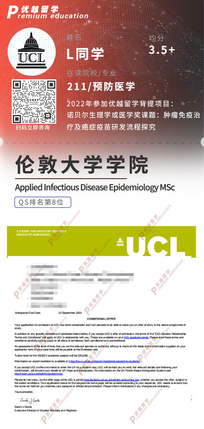 2023offer:恭喜L同學(xué)在碩士留學(xué)申請(qǐng)中獲得UCL應(yīng)用傳染病流行病學(xué)理學(xué)碩士通知書(shū)!