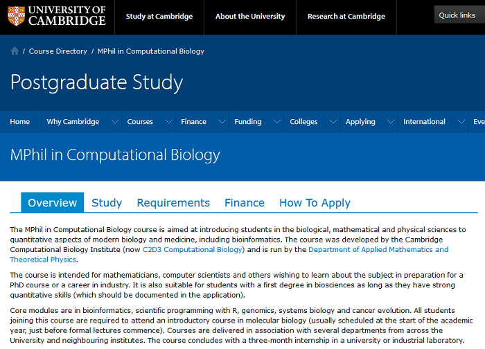本課程的申請(qǐng)者應(yīng)獲得英國(guó)2:1榮譽(yù)學(xué)位以上,或同等海外學(xué)歷。本科來(lái)自生物、數(shù)學(xué)、計(jì)算機(jī)科學(xué)、物理學(xué)等相關(guān)學(xué)科背景。