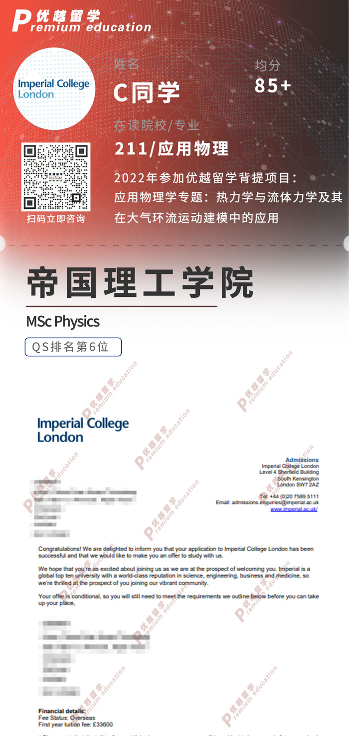 2023offer來襲!恭喜C同學(xué)在碩士留學(xué)申請中斬獲帝國理工學(xué)院物理學(xué)碩士錄取通知!