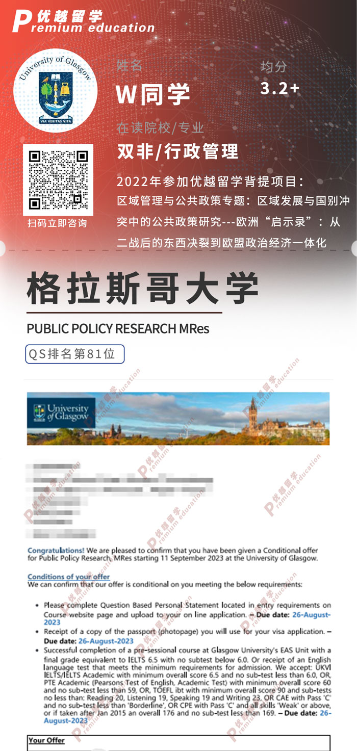 2023offer來(lái)襲!恭喜W同學(xué)在碩士留學(xué)申請(qǐng)中斬獲格拉斯哥大學(xué)公共政策研究碩士通知書!