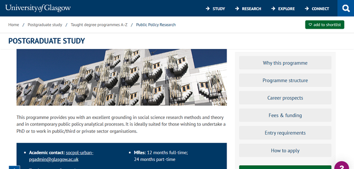 無(wú)論是為了在公共與志愿部門進(jìn)行工作還是為了一步攻讀博士學(xué)位,該計(jì)劃為公共政策的高級(jí)研究提供了堅(jiān)實(shí)的基礎(chǔ)。學(xué)生在格拉斯哥的城市環(huán)境中研究公共政策理論和實(shí)踐,可以直接參與我們這個(gè)時(shí)代許多最緊迫的公共政策問(wèn)題,并為這些問(wèn)題而制定解決方案。課程將去倫敦實(shí)地考察受矚目的房地產(chǎn),以及規(guī)劃和再生項(xiàng)目。讓學(xué)生深入了解城市建設(shè)和設(shè)計(jì)的復(fù)雜社會(huì)經(jīng)濟(jì)動(dòng)態(tài)。