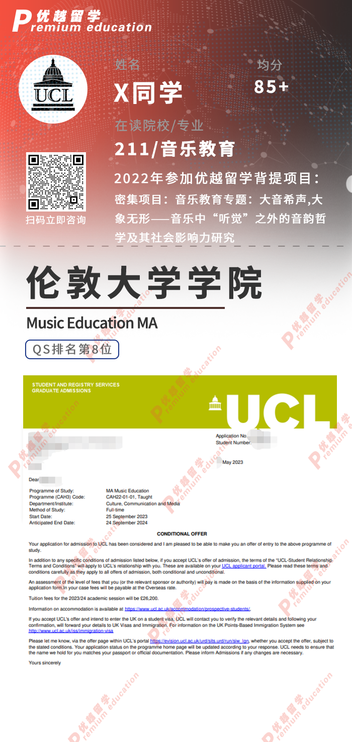 2023offer來襲!恭喜X同學(xué)在碩士留學(xué)申請中斬獲倫敦大學(xué)學(xué)院UCL音樂教育碩士通知書!