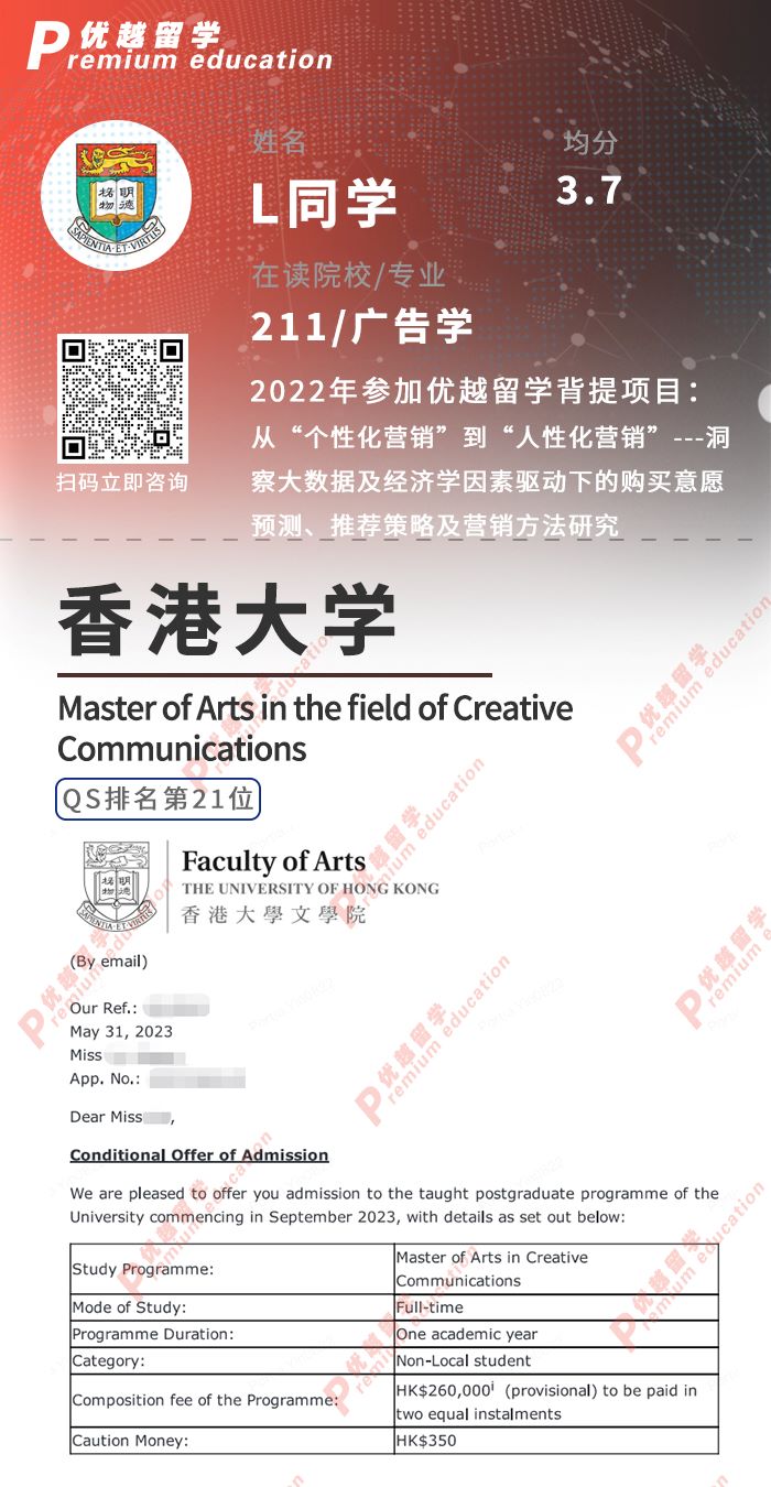 2023offer來襲!恭喜L同學(xué)在碩士留學(xué)申請(qǐng)中斬獲倫香港大學(xué)創(chuàng)意傳播碩士通知書!