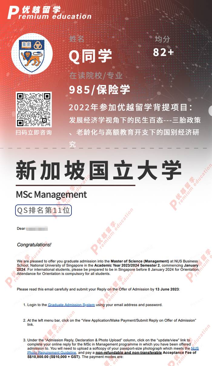 2023offer來(lái)襲!恭喜Q同學(xué)在碩士留學(xué)申請(qǐng)中斬獲新加坡國(guó)立大學(xué)管理學(xué)碩士通知書(shū)!