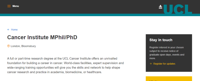 錄取專業(yè):MPhil/PhD Cancer Institute