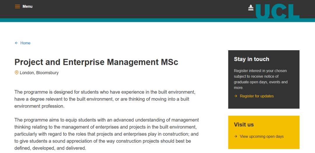 UCL的項目與企業(yè)管理碩士課程專為具有建筑環(huán)境工作經(jīng)驗、擁有建筑環(huán)境相關(guān)學(xué)位或打算轉(zhuǎn)入建筑環(huán)境行業(yè)的學(xué)生而設(shè)計。該課程旨在讓學(xué)生深入了解與建筑環(huán)境中的企業(yè)和項目管理有關(guān)的管理思想,特別是項目和企業(yè)在建筑中的作用,并讓學(xué)生充分了解建筑項目最好的定義與開發(fā)和交付的方式。建筑環(huán)境學(xué)科包括工程、建筑、測量、施工管理、城市規(guī)劃和設(shè)計、經(jīng)濟和金融以及與可持續(xù)性相關(guān)的主題。作為一個主要面向社會科學(xué)的課程,該計劃還歡迎在地理,商業(yè)研究,哲學(xué)等領(lǐng)域有學(xué)位或有相關(guān)實踐經(jīng)驗、并希望將其專業(yè)知識用于建筑環(huán)境的學(xué)生。