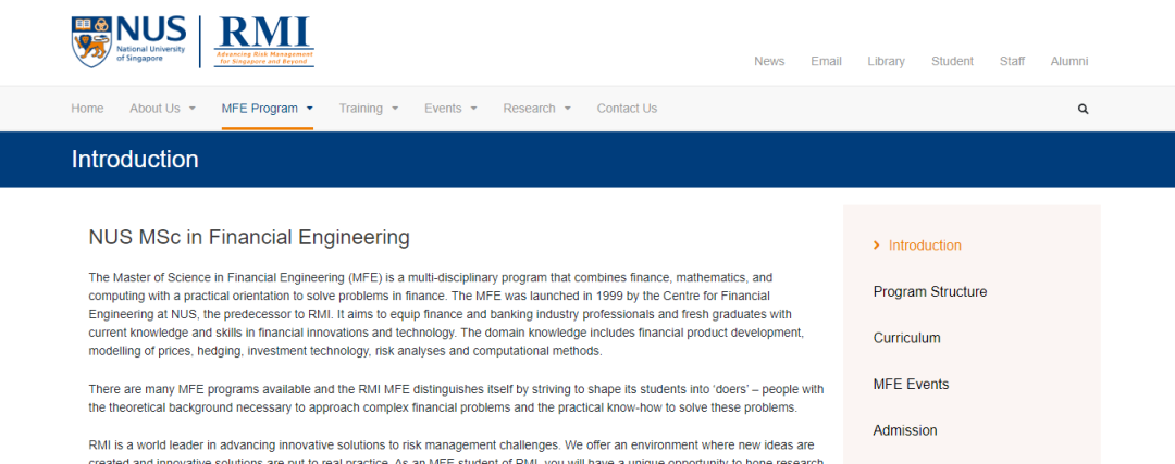 金融工程理學(xué)碩士(MFE)是一個(gè)多學(xué)科項(xiàng)目,將金融、數(shù)學(xué)和計(jì)算機(jī)結(jié)合起來(lái),以解決金融問(wèn)題的實(shí)踐為導(dǎo)向。MFE由新加坡國(guó)立大學(xué)金融工程中心(RMI 的前身)1999年推出,旨在為金融和銀行業(yè)專業(yè)人士和應(yīng)屆畢業(yè)生提供金融創(chuàng)新和技術(shù)方面的最新知識(shí)和技能。領(lǐng)域知識(shí)包括金融產(chǎn)品開(kāi)發(fā)、價(jià)格建模、對(duì)沖、投資技術(shù)、風(fēng)險(xiǎn)分析和計(jì)算方法。