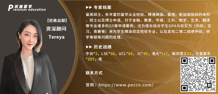 本案例的留學顧問是優(yōu)越倫敦的Tereya老師,留英碩士,有豐富的留學從業(yè)經(jīng)驗,稍通英國、香港、新加坡院校的本科碩士以及博士申請。對于金融、教育、傳媒、工科、數(shù)學、藝術、翻譯等專業(yè)諸多的G5等申請案例,尤為擅長結(jié)合學生GPA與軟實力 《科研、實習、競賽等)來為學生精準鎖定院校專業(yè),以及其他二等二成編申碩、轉(zhuǎn)學等疑難問題的處理。