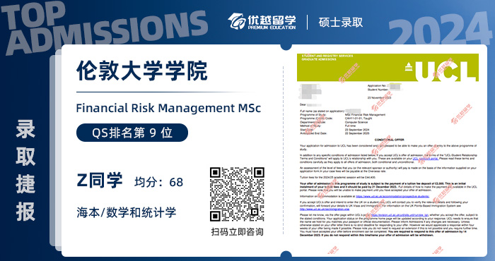 2024重磅offer來(lái)襲!恭喜Z同學(xué)在碩士留學(xué)申請(qǐng)中斬獲倫敦大學(xué)學(xué)院UCL金融風(fēng)險(xiǎn)管理碩士錄??!