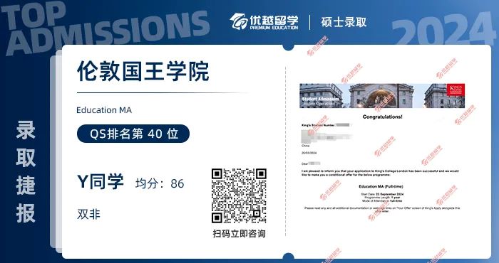 以上是【【倫敦國王學(xué)院】聽說你也在等KCL發(fā)offer?新一輪offer接收中!】相關(guān)的全部內(nèi)容,查看更多【offer榜單】、【名校案例】相關(guān)資訊可前往【優(yōu)越留學(xué)】首頁!世界名校申請,找優(yōu)越留學(xué)!選校定校、申請規(guī)劃、文書寫作、背景提升、方案定制一套搞定!點(diǎn)擊【在線咨詢】,優(yōu)越留學(xué)顧問24h在線為您一對一解答!
