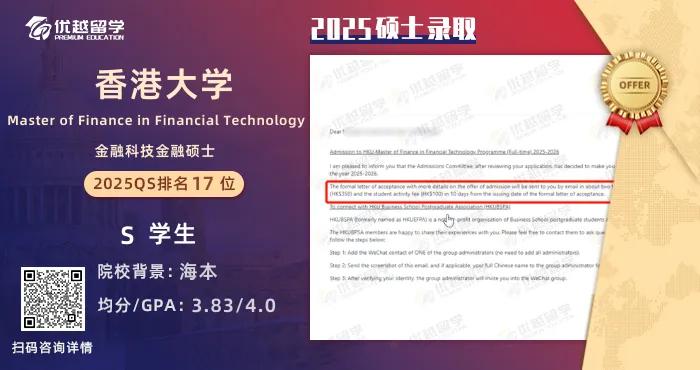 以上是【【香港大學(xué)】優(yōu)越留學(xué)學(xué)員斬獲金融科技金融碩士offer(提前批) 】相關(guān)的全部內(nèi)容,查看更多【offer榜單】、【名校案例】相關(guān)資訊可前往【優(yōu)越留學(xué)】首頁!世界名校申請,找優(yōu)越留學(xué)!選校定校、申請規(guī)劃、文書寫作、背景提升、方案定制一套搞定!點擊【在線咨詢】,優(yōu)越留學(xué)顧問24h在線為您一對一解答!