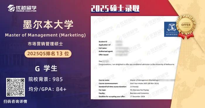 以上是【2025offer上新:【墨爾本大學(xué)】已發(fā)市場營銷管理碩士offer!】相關(guān)的全部內(nèi)容,查看更多【offer榜單】、【名校案例】相關(guān)資訊可前往【優(yōu)越留學(xué)】首頁!世界名校申請,找優(yōu)越留學(xué)!選校定校、申請規(guī)劃、文書寫作、背景提升、方案定制一套搞定!點(diǎn)擊【在線咨詢】,優(yōu)越留學(xué)顧問24h在線為您一對一解答!