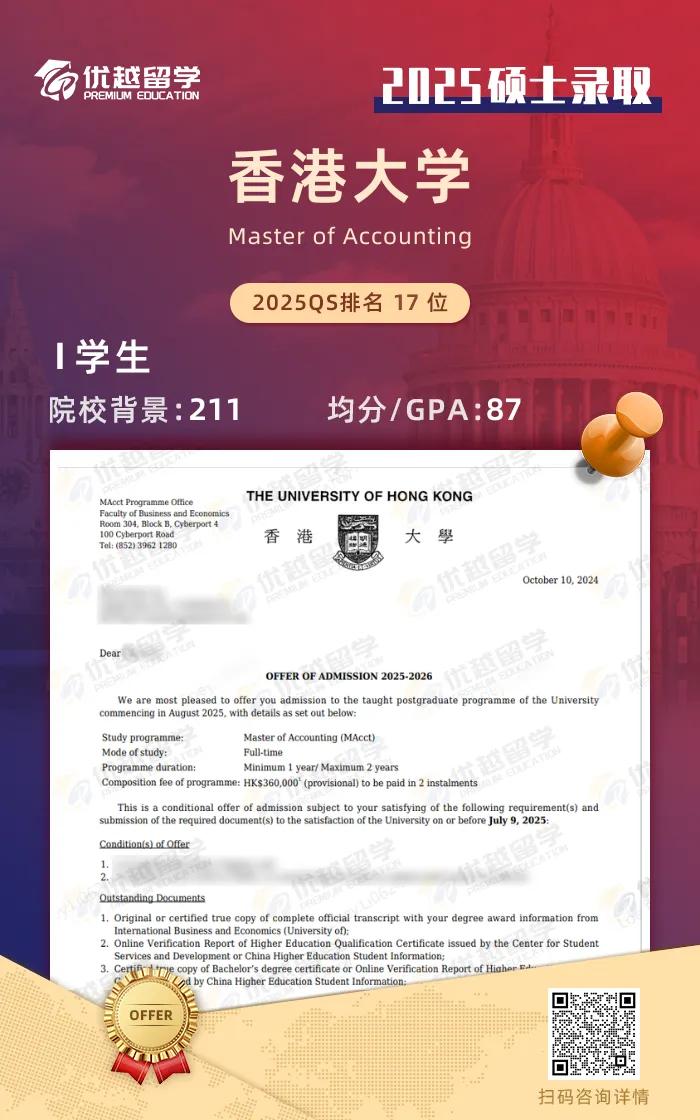 以上是【25fall提前批offer上新!香港大學(xué)已發(fā)會(huì)計(jì)碩士offer 】相關(guān)的全部?jī)?nèi)容,查看更多【offer榜單】、【名校案例】相關(guān)資訊可前往【優(yōu)越留學(xué)】首頁(yè)!世界名校申請(qǐng),找優(yōu)越留學(xué)!選校定校、申請(qǐng)規(guī)劃、文書(shū)寫(xiě)作、背景提升、方案定制一套搞定!點(diǎn)擊【在線咨詢(xún)】,優(yōu)越留學(xué)顧問(wèn)24h在線為您一對(duì)一解答!
