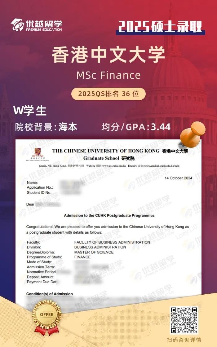 恭喜優(yōu)越學(xué)員碩士研究生申請拿下香港中文大學(xué)金融碩士offer。接下來,就跟優(yōu)越君一起看看,W同學(xué)的上岸歷程~