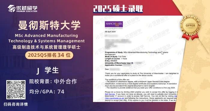 恭喜優(yōu)越學(xué)員碩士研究生申請首戰(zhàn)告捷,拿下曼徹斯特大學(xué)高級制造技術(shù)與系統(tǒng)管理碩士offer。接下來,就跟優(yōu)越君一起看看,J同學(xué)的上岸歷程~