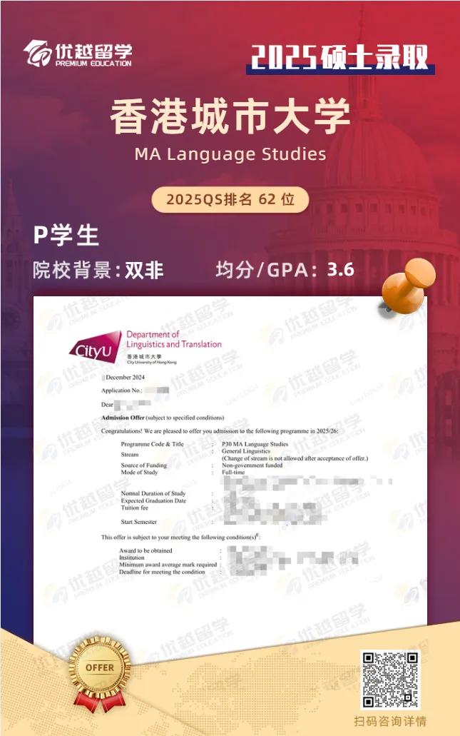 以上是【25fall香港碩士offer+1!雙非錄取【香港城市大學(xué)】語(yǔ)言研究專業(yè)】相關(guān)的全部?jī)?nèi)容,查看更多【offer榜單】、【名校案例】相關(guān)資訊可前往【優(yōu)越留學(xué)】首頁(yè)!世界名校申請(qǐng),找優(yōu)越留學(xué)!選校定校、申請(qǐng)規(guī)劃、文書寫作、背景提升、方案定制一套搞定!點(diǎn)擊【在線咨詢】,優(yōu)越留學(xué)顧問24h在線為您一對(duì)一解答!