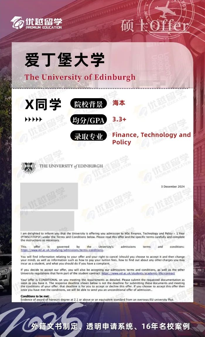 以上是【25fall英國(guó)留學(xué)碩士offer:優(yōu)越再添一枚【愛(ài)丁堡大學(xué)】金融、技術(shù)和政策專(zhuān)業(yè)】相關(guān)的全部?jī)?nèi)容,查看更多【offer榜單】、【名校案例】相關(guān)資訊可前往【優(yōu)越留學(xué)】首頁(yè)!世界名校申請(qǐng),找優(yōu)越留學(xué)!選校定校、申請(qǐng)規(guī)劃、文書(shū)寫(xiě)作、背景提升、方案定制一套搞定!點(diǎn)擊【在線咨詢(xún)】,優(yōu)越留學(xué)顧問(wèn)24h在線為您一對(duì)一解答!