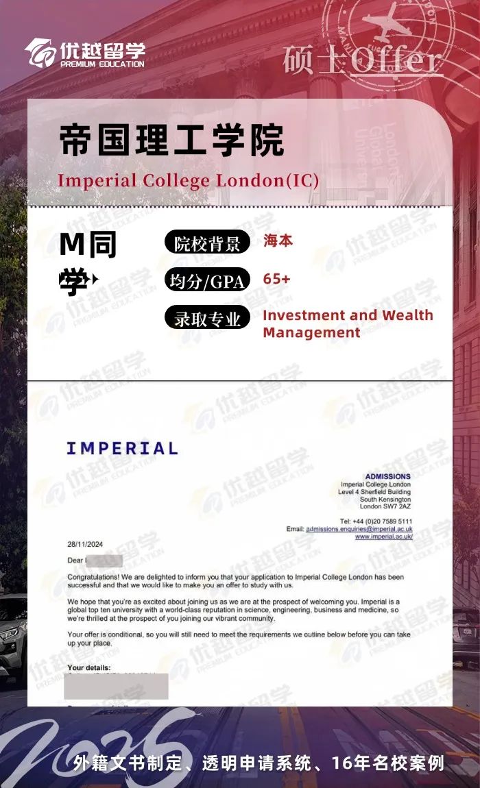 以上是【25fall英國G5碩士offer:【帝國理工學(xué)院】商學(xué)院投資與財(cái)富管理專業(yè)】相關(guān)的全部內(nèi)容,查看更多【offer榜單】、【名校案例】相關(guān)資訊可前往【優(yōu)越留學(xué)】首頁!世界名校申請,找優(yōu)越留學(xué)!選校定校、申請規(guī)劃、文書寫作、背景提升、方案定制一套搞定!點(diǎn)擊【在線咨詢】,優(yōu)越留學(xué)顧問24h在線為您一對一解答!