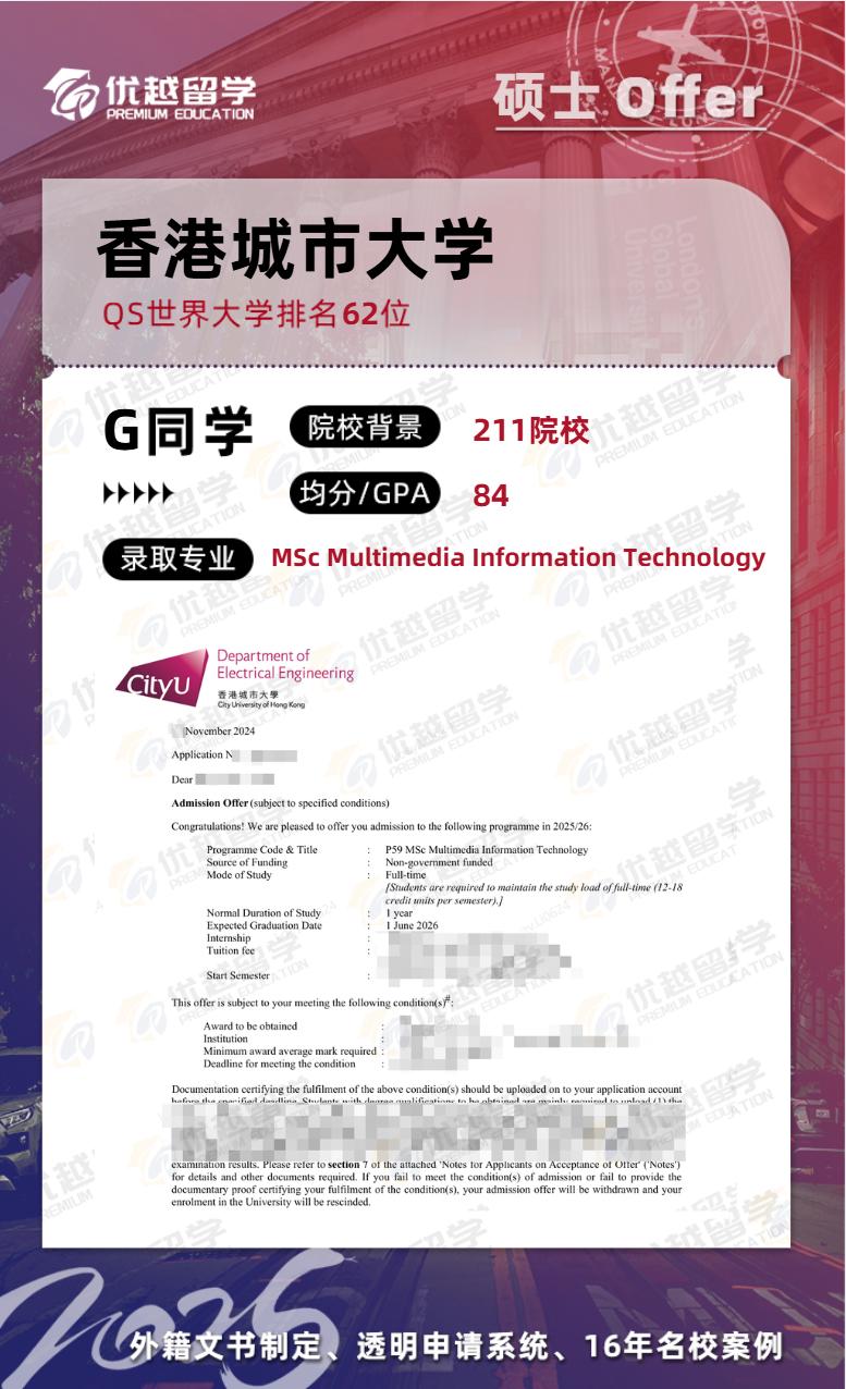 以上是【25fall香港碩士留學(xué)中介offer+1:【香港城市大學(xué)】多媒體信息技術(shù)專業(yè)】相關(guān)的全部內(nèi)容,查看更多【offer榜單】、【名校案例】相關(guān)資訊可前往【優(yōu)越留學(xué)】首頁!世界名校申請,找優(yōu)越留學(xué)!選校定校、申請規(guī)劃、文書寫作、背景提升、方案定制一套搞定!點擊【在線咨詢】,優(yōu)越留學(xué)顧問24h在線為您一對一解答!