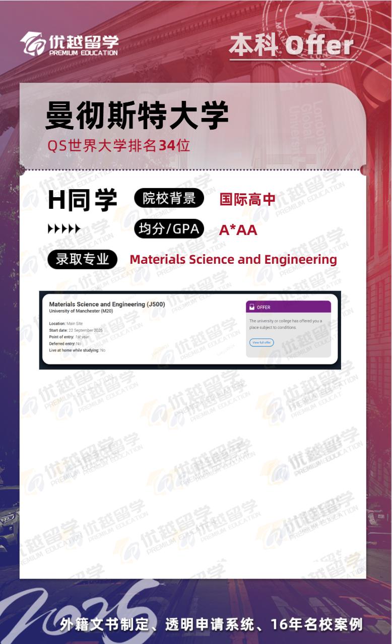 恭喜優(yōu)越學(xué)員英國本科申請(qǐng)首戰(zhàn)告捷,順利斬獲曼徹斯特大學(xué)材料科學(xué)與工程專業(yè)offer。接下來,就跟優(yōu)越君一起看看,H同學(xué)的上岸歷程~