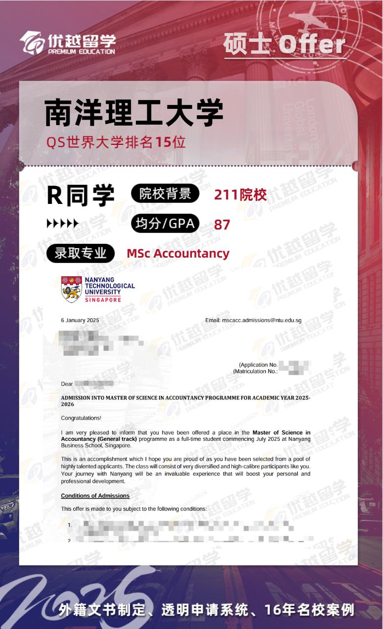 以上是【25fall新加坡留學中介逆襲offer:跨專業(yè)錄取【南洋理工大學】會計碩士】相關的全部內容,查看更多【offer榜單】、【名校案例】相關資訊可前往【優(yōu)越留學】首頁!世界名校申請,找優(yōu)越留學!選校定校、申請規(guī)劃、文書寫作、背景提升、方案定制一套搞定!點擊【在線咨詢】,優(yōu)越留學顧問24h在線為您一對一解答!