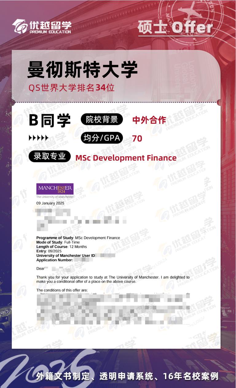 以上是【2025英國碩士留學(xué)機(jī)構(gòu)offer:【曼徹斯特大學(xué)】發(fā)展金融學(xué)專業(yè)】相關(guān)的全部內(nèi)容,查看更多【offer榜單】、【名校案例】相關(guān)資訊可前往【優(yōu)越留學(xué)】首頁!世界名校申請(qǐng),找優(yōu)越留學(xué)!選校定校、申請(qǐng)規(guī)劃、文書寫作、背景提升、方案定制一套搞定!點(diǎn)擊【在線咨詢】,優(yōu)越留學(xué)顧問24h在線為您一對(duì)一解答!