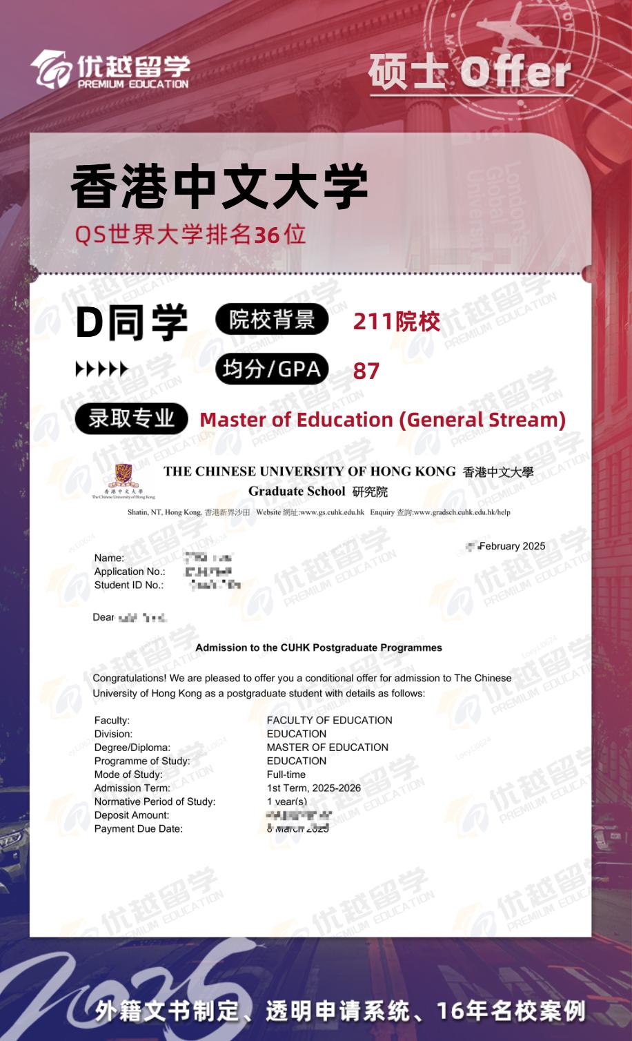 恭喜優(yōu)越學(xué)員碩士研究生申請首戰(zhàn)告捷,拿下香港中文大學(xué)教育學(xué)碩士offer。接下來,就跟優(yōu)越君一起看看這位同學(xué)的上岸歷程~