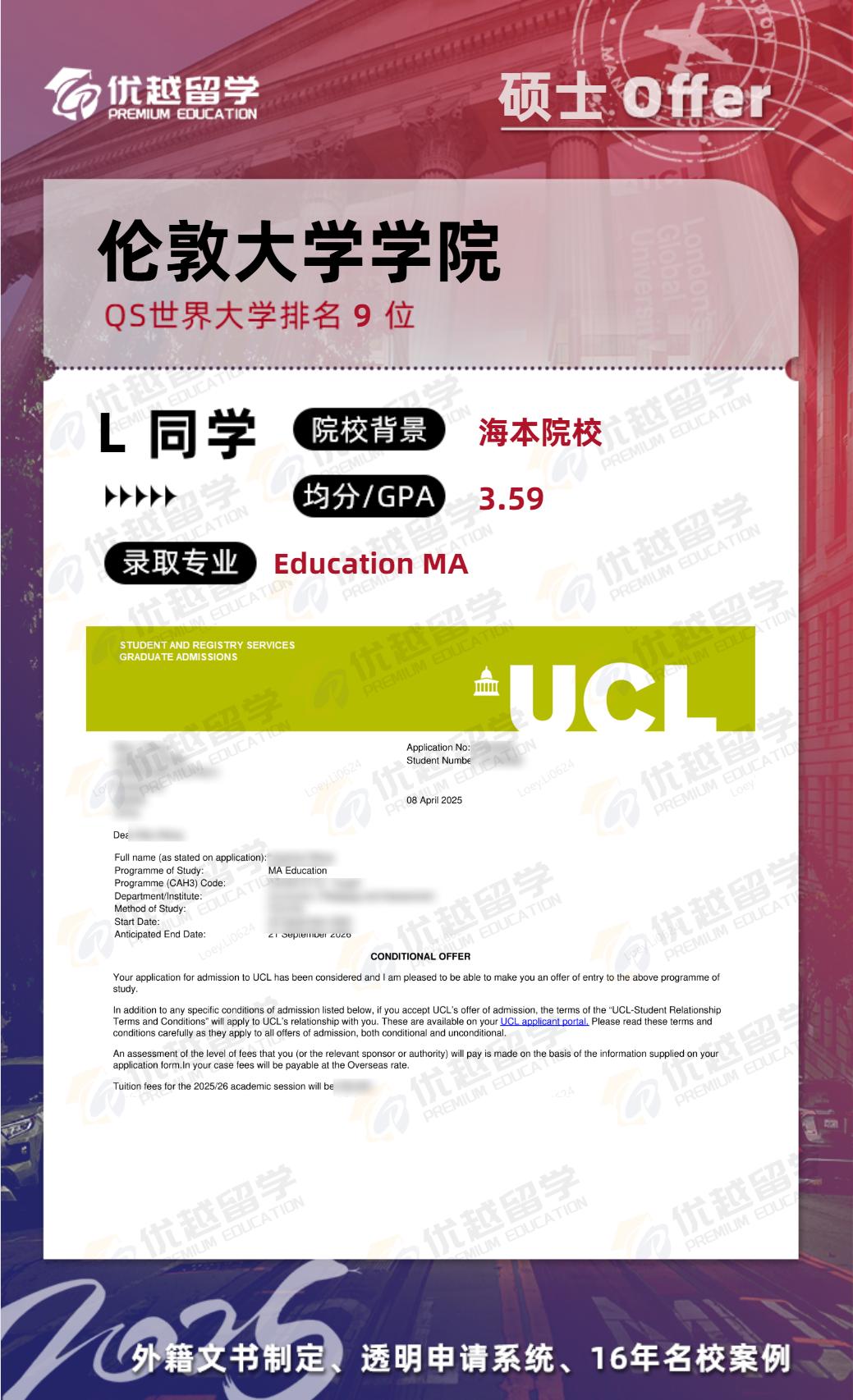 L同學(xué)是去年7月來到優(yōu)越的,本科專業(yè)土木工程,跨專業(yè)上岸UCL教育碩士offer。接下來,就跟優(yōu)越君一起看看這位同學(xué)的英國留學(xué)研究生申請上岸歷程吧~