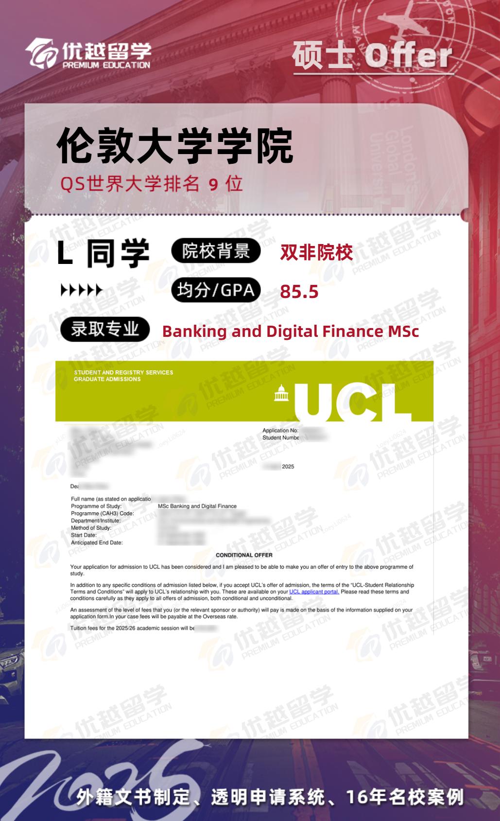 以上是【25fall英國(guó)碩士offer:雙非錄取【倫敦大學(xué)學(xué)院UCL】銀行與數(shù)字金融專業(yè)】相關(guān)的全部?jī)?nèi)容,查看更多【offer榜單】、【名校案例】相關(guān)資訊可前往【優(yōu)越留學(xué)】首頁!世界名校申請(qǐng),找優(yōu)越留學(xué)!選校定校、申請(qǐng)規(guī)劃、文書寫作、背景提升、方案定制一套搞定!點(diǎn)擊【在線咨詢】,優(yōu)越留學(xué)顧問24h在線為您一對(duì)一解答!