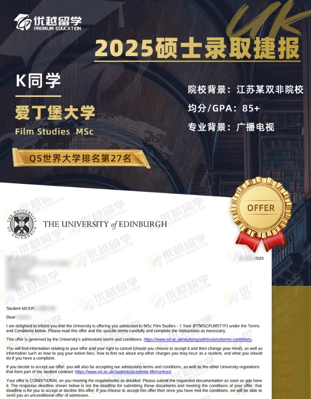 恭喜優(yōu)越學(xué)員碩士研究生申請捷報頻傳,拿下愛丁堡大學(xué)電影研究碩士offer。接下來,就跟優(yōu)越君一起看看這位同學(xué)的上岸歷程~