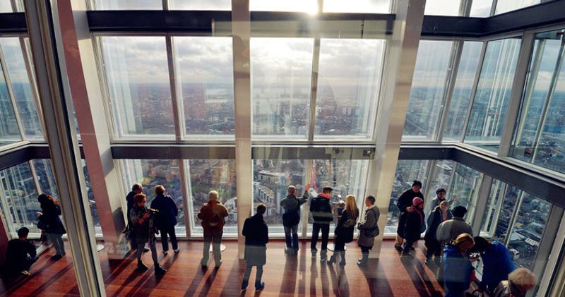 乘坐上6米每秒的快速升降機(jī)到達(dá)68層后,就來到了壓軸地點(diǎn)——公共觀景臺(tái)了,這是一片由玻璃合抱而成的環(huán)形區(qū)域,倫敦?zé)o與倫比的全景視圖將會(huì)完美地呈現(xiàn)在你眼前:厚重圓頂?shù)氖ケA_大教堂、金融區(qū)同為玻璃建筑的炮筒型“小黃瓜”以及縱橫交錯(cuò)的鐵軌線路,與之飛舞的還有導(dǎo)演阿爾弗雷德·希區(qū)柯克的逃離的鴿子。