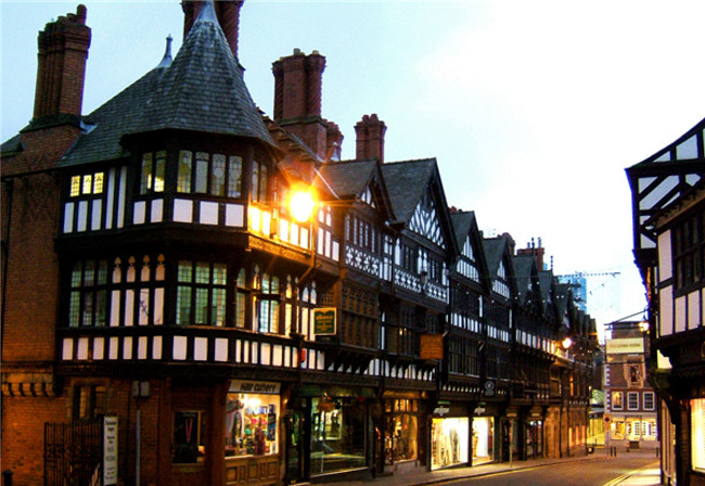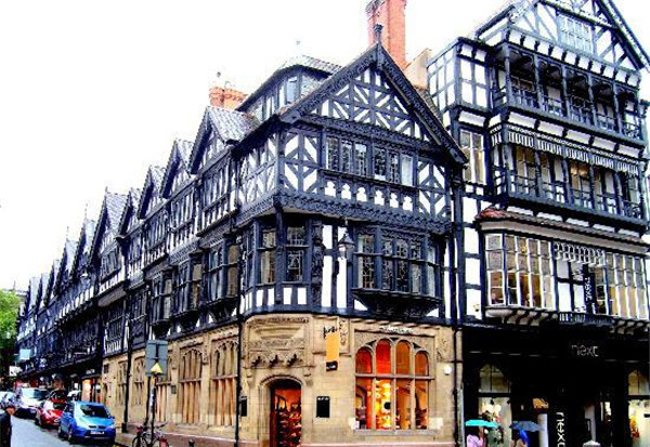 在英國(guó)各個(gè)地方,都可以看到由木頭搭建,黑色的木梁,白色的墻的建筑,比如倫敦的Liberty百貨,看起來(lái)格外的黑白分明。一共四層的建筑,最低的兩層一般臨街,多用作商鋪,人們稱這種建筑為T(mén)he Rows街邊廊。而這種有著高聳的雙面斜頂,突出的山墻以及小型方格玻璃,用黑色木頭裝飾的白色半木結(jié)構(gòu)建筑,正是采取了中世紀(jì)都鐸式風(fēng)格,其真正叫Chester Rows, 故名思議,切斯特正是這種最獨(dú)一無(wú)二建筑的發(fā)源地。