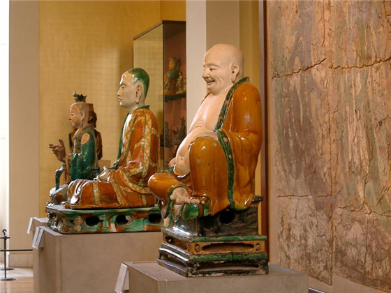 ??2. 中國廳中央墻上有幾十平方米的壁畫(33號展廳盡頭墻壁上),畫上的三尊菩薩裙帶飛揚,面容慈祥,形象端莊,體態(tài)豐滿,神貌各異。盡管年代久遠,依然可以看出當年的絢麗色彩。割痕把畫面分成了12塊。不少媒體稱其為敦煌壁畫,然而大英博物館的說明已經(jīng)證實此壁畫來自于五臺山下的寺廟(河北省行唐縣的清涼寺),全壁畫由幾萬片大小不一的碎片精細粘合而成。據(jù)稱,1926年秋冬,英國人與當時的縣政府勾結(jié),買走了三菩薩壁畫。后在日寇侵華期間幾經(jīng)戰(zhàn)亂,清涼寺被夷為平地,余下的所有壁畫在文革中被全部損毀。