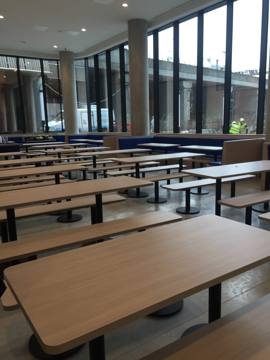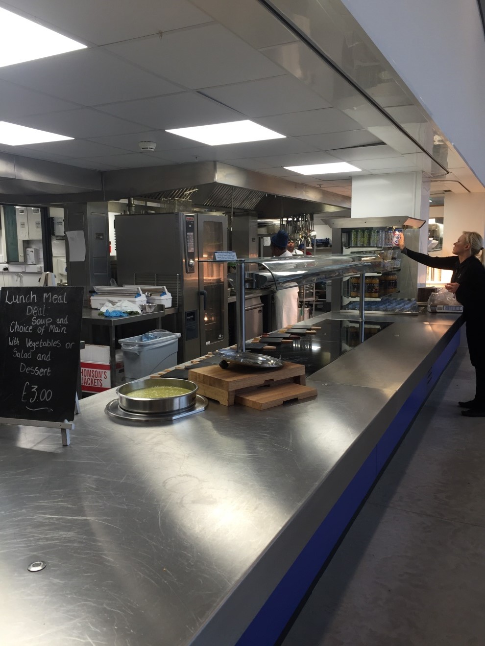 ??出得教室辦公樓,移步學校餐廳,雖還未到開飯時間,可從廚房里隱隱飄出的炸雞的香味便已經(jīng)讓小編垂涎欲滴了。小編算不上吃貨,但對售飯窗口處標明的各類熱菜菜單毫無抵抗力。光可鑒人的供餐臺,纖塵不染的桌椅,以及秀色可餐的waiter,讓本來只能吃一碗飯的小編瞬間產生了多吃兩碗的沖動。