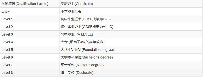 英國有自己獨特的教育系統(tǒng),與中國比較不同,學(xué)歷從入門級(Entry)到第8級(Level 8),一共9個等級,見下表: