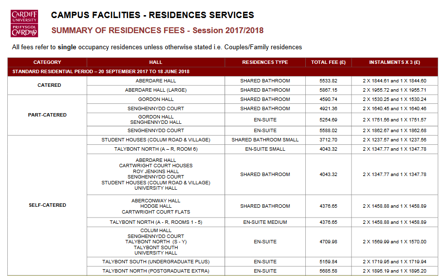 學校宿舍:倫敦和倫敦以外還是有一定差距的,可以感受一下LSE(倫敦)和卡迪夫(倫敦外)的住宿收費情況:(下圖為部分宿舍區(qū)收費情況)