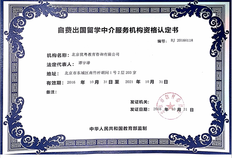 中國:中華人民共和國教育部自費(fèi)出國留學(xué)中介服務(wù)機(jī)構(gòu)資格認(rèn)定書編號(hào):BJ20160118--北京優(yōu)粵教育咨詢有限公司(優(yōu)越教育國際北京下屬分公司),相關(guān)認(rèn)證信息可登陸中華人民共和國教育部教育涉外監(jiān)管信息網(wǎng)jsj.edu.cn查詢。
