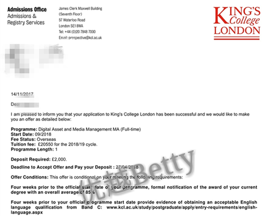 學(xué)生背景:D同學(xué),2018年6月本科畢業(yè),申請2018年9月入學(xué)的英國研究生,浙江傳媒學(xué)院,文化產(chǎn)業(yè)管理專業(yè),均分89,無雅思申請,拿到了KCL:Film Studies專業(yè)的offer。